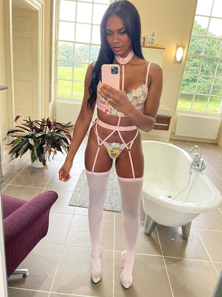Our 4 piece Baby set includes Bra, Thong, Garter, adjustable neck strap. Matching stockings and matching attachable leg suspenders.