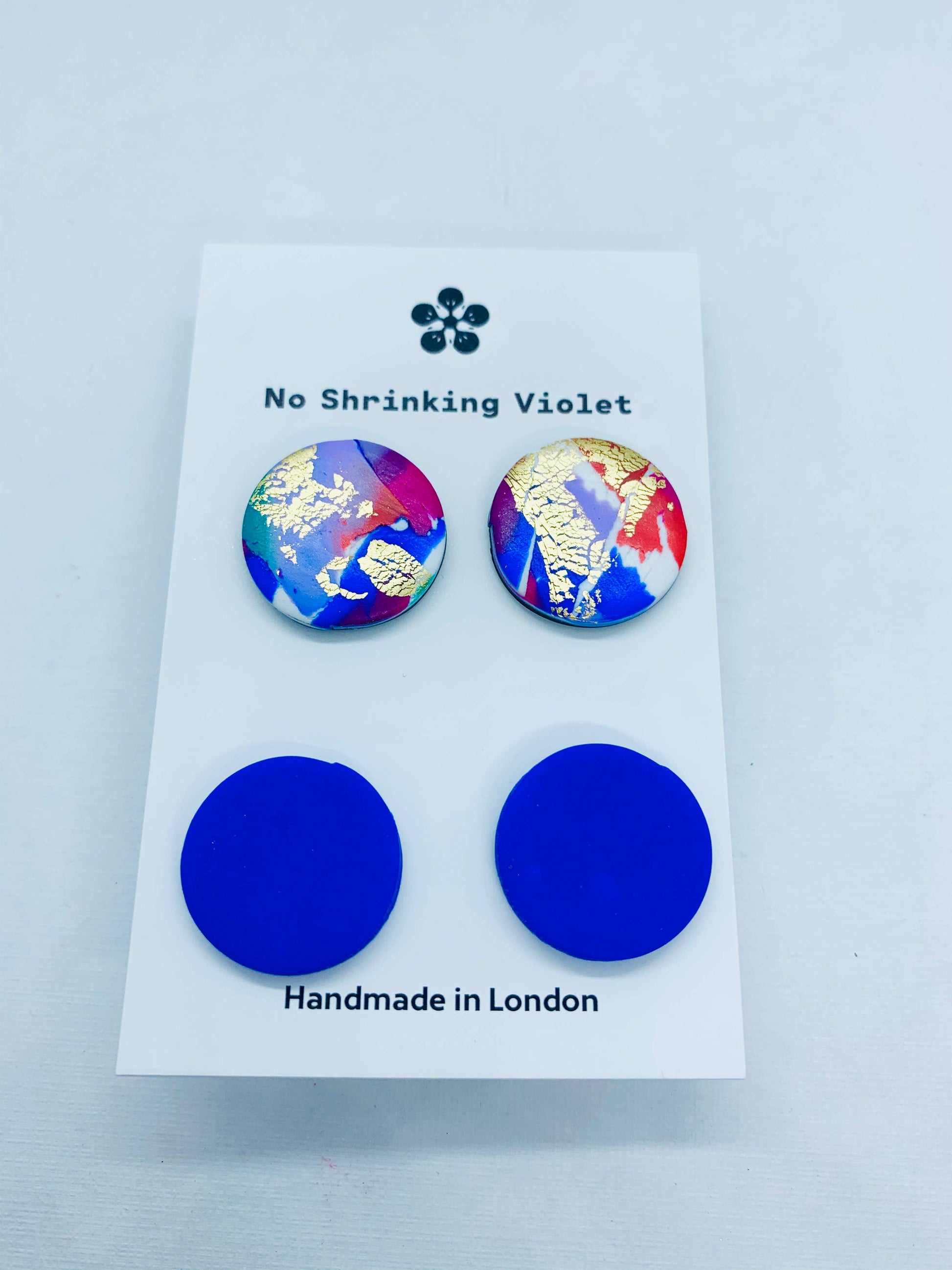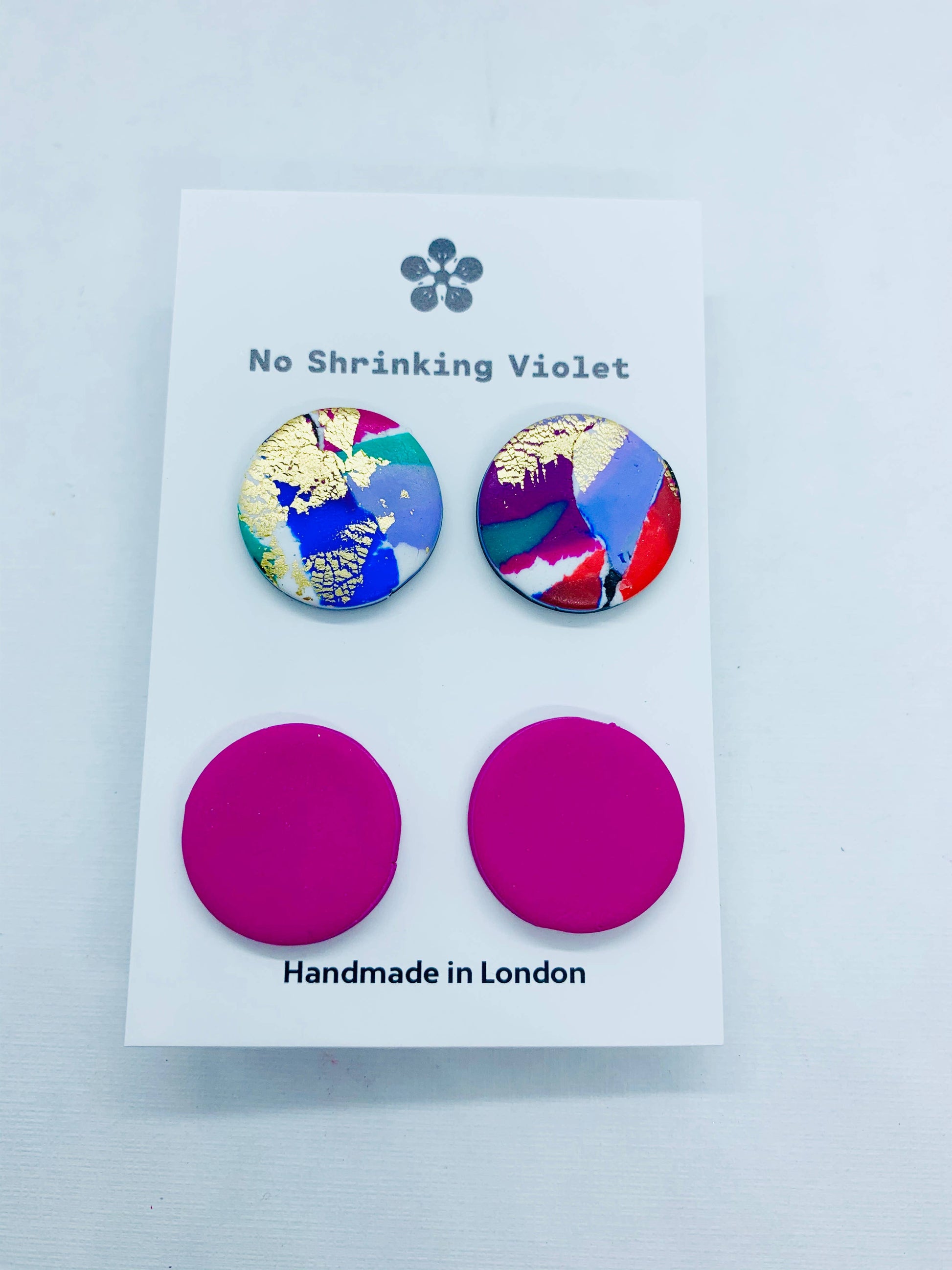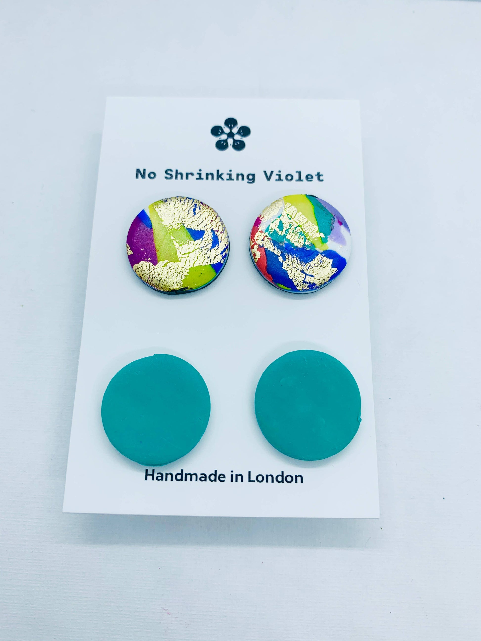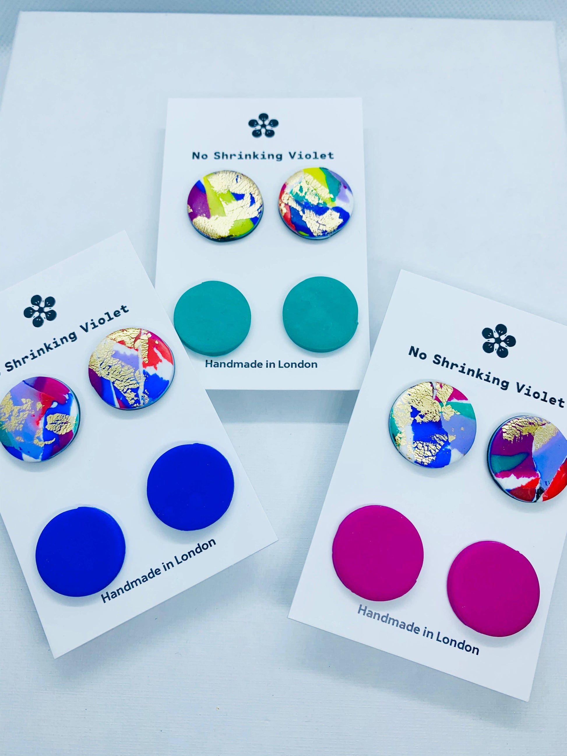 Bold and bright handmade polymer clay earrings with gold accents, with a bold matching block colour.
